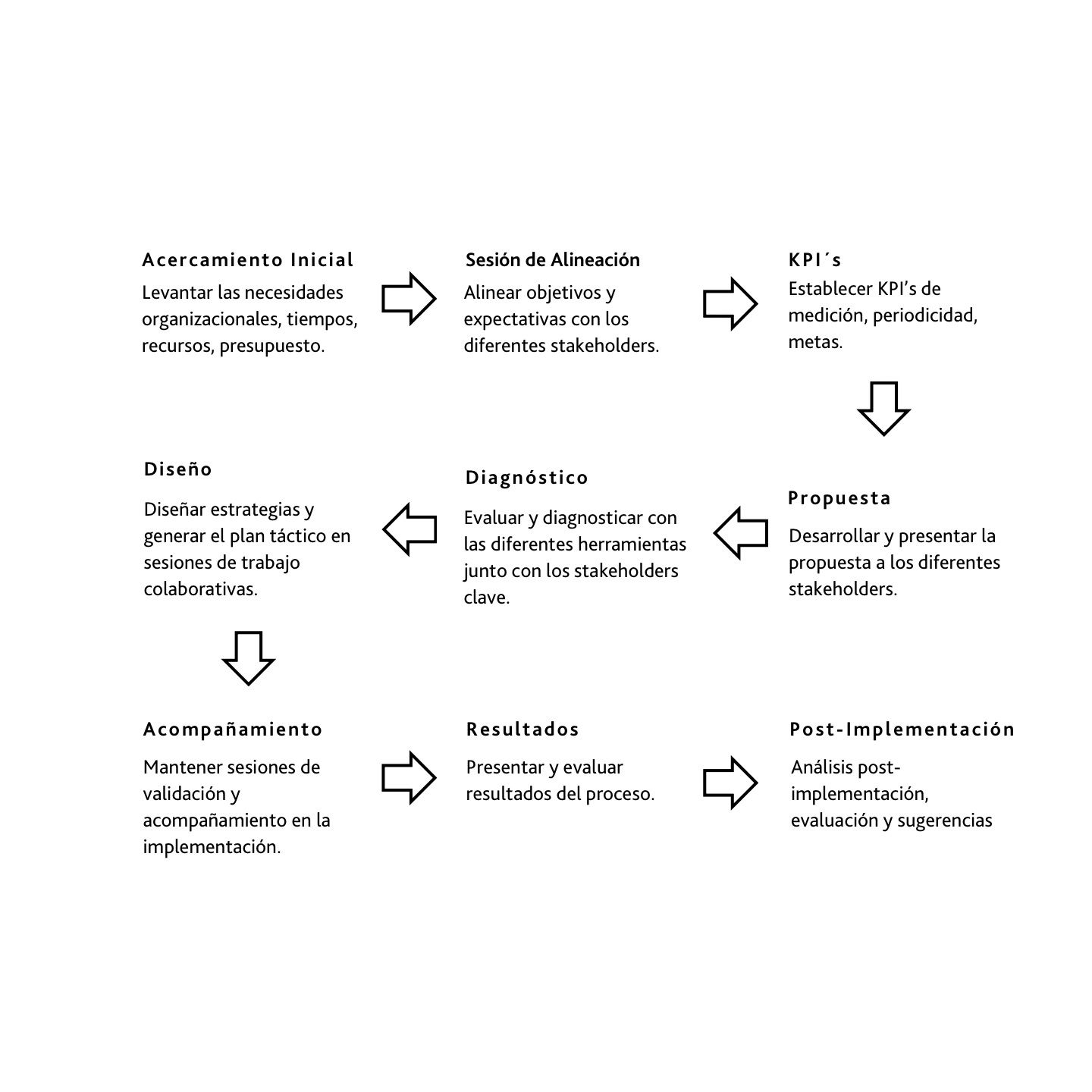 Nuestra metodología integra un enfoque estratégico y colaborativo que acompaña a tu organización desde la comprensión inicial de sus necesidades hasta la implementación y evaluación de soluciones. Cada etapa ha sido diseñada para asegurar claridad, alineación y resultados medibles, garantizando procesos transparentes, participativos y orientados a fortalecer el crecimiento del talento y del negocio.